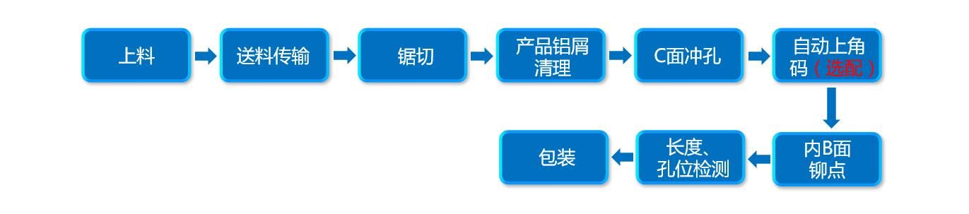本光伏邊框生產線將機器人的智能化引入、融進該項加工工藝,為用戶生產需求量身定制。由送料傳輸、鋸切、C面沖孔、自動上角碼、內B面鉚點、長度、孔位檢測、包裝等工序組成。該光伏邊框生產線可以由傳統沖壓線及標準鋸切機及常用模具配合自動上料鋸切,下料機器人沖壓及自動上角碼,鉚點及下料等工序組成,結合了手工線的優勢,并采用機器人及智能傳料。并采用總線控制運動控制系統,滿足制造工藝的自動化控制要求,實現高效率、高精度,實現全自動化。為光伏邊框生產廠家所面臨的自動化程度低、產品質量不穩定、作業人員工作強度大等問題提供了智能自動化解決方案。